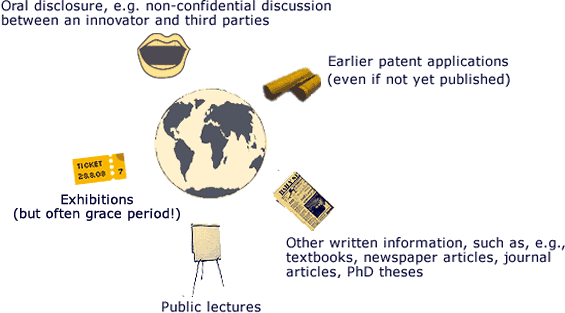 You as a patent examiner have to look anywhere in the world for prior art. Here you see the variety of information you can take into account when examining novelty. This list is, however, not exhaustive.