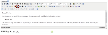 The iDevice is very easy to handle. By clicking on "Free Text" in the iDevice Pane, the editor view opens in the Authoring Pane and the iDevice can be filled with your resources.