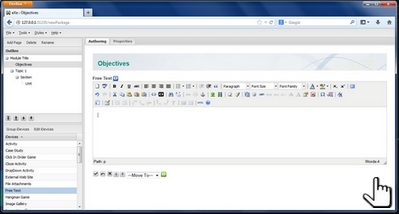 is done by inserting iDevices. Select any iDevices from the iDevice pane and fill it with the desired content in the Authoring Pane. Here you can include text, images (which were optimised for web and stored locally). The basic functionality is identical for all iDevices: you select the iDevice through a mouseclick. Then enter texts, pictures, audio, Flash, etc., as needed. Ideally, you already have these resources available in a project folder.