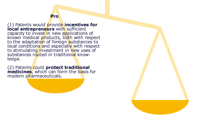To see the arguments advanced pro and contra patents on new uses of known substances, please move your mouse over the scale below.